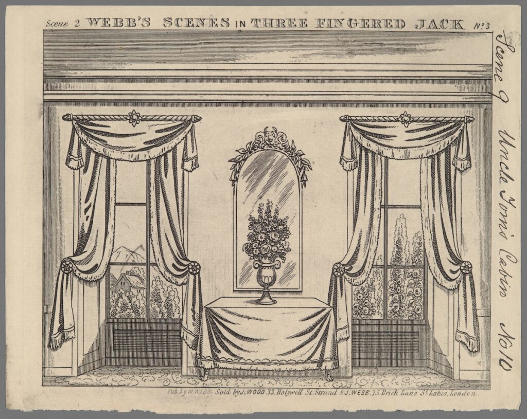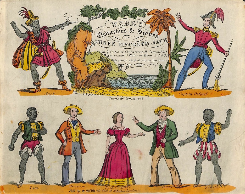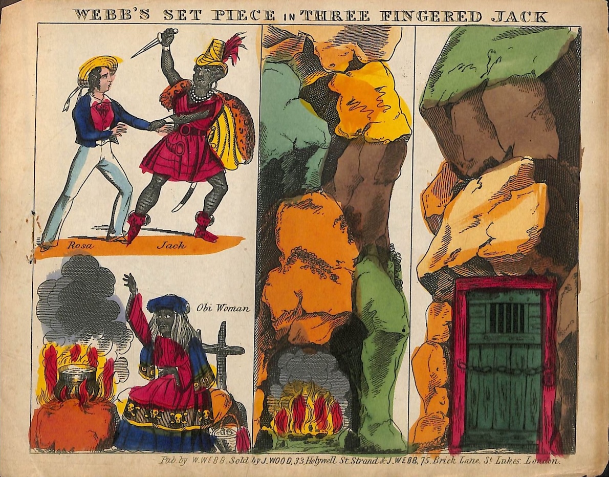 [1] Three Fingered Jack: A Drama in Two Acts, Written Expressly for, and Adapted Only to Webb’s Characters & Scenes in the Same, Webb’s Juvenile Drama (W. Webb, n.d. [c. 1850]). Although the prints that comprise the toy theater set are not dated, they indicate that they were also for sale at Joseph Wood’s shop at 33 Holywell Street. The esteemed antiquarian bookseller Laurence Worms notes that Wood had his printshop at this address from 1845 until about 1860. See Worms, “J. T. Wood of the Strand,” The Bookhunter on Safari, July 30, 2013, https://ashrarebooks.com/2013/07/30/j-t-wood-of-the-strand/ (all web links accessed February 11, 2026).