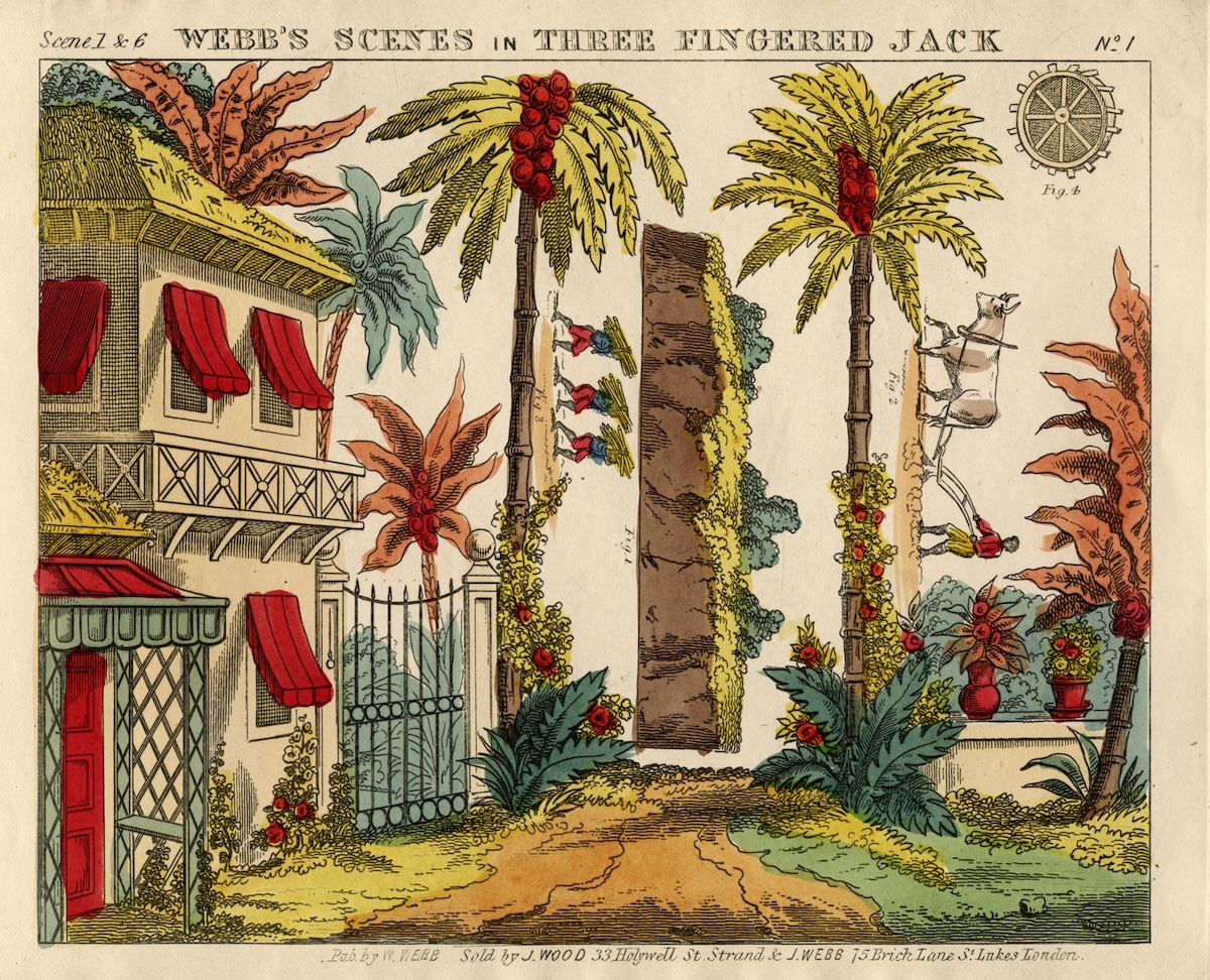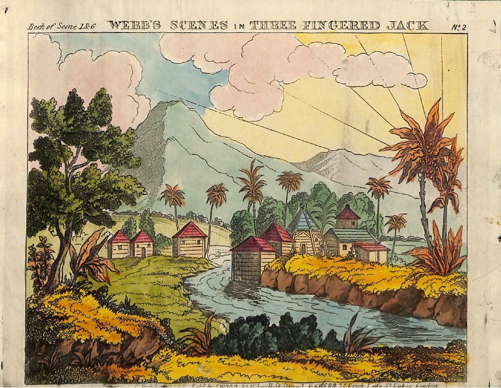 Fig. 5. William Webb, Webb’s Scenes in Three Fingered Jack, n.d. (c. 1850). Hand-colored engraving, 17 x 21.5 cm. Toy Theater Prints of Characters and Scenes, 1811-1855, AS MS THR 944, Houghton Library, Harvard University.