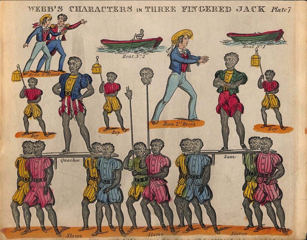 On this day, the youth would perform the infamous story of Jack, the real-life Black man who escaped enslavement in Jamaica in the late-1770s and evaded capture until his murder in 1781. The British public were fascinated with the story of Jack and his exploits from its first publication in newsprint in 1780. A book appeared in 1799, quickly followed by a pantomime stage play, a novel based on the pantomime, and a fictionalized epistolary tale (all issued in 1800), and, by the mid-nineteenth century, a stage melodrama. Over the last two decades scholars have attended to the varying representations of this figure, who signified slavery and colonization, but also revolt.[4] To date, however, this toy theater has not been considered in these analyses.