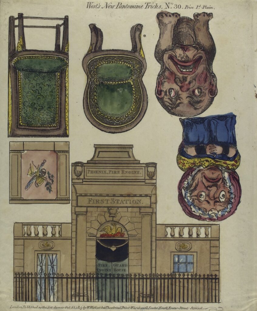 Fig. 8. William West, West’s New Pantomime Tricks, 1813. Hand-colored engraving, 23.5 x 19 cm. Billy Rose Theatre Division, The New York Public Library. “Sets and scenery” New York Public Library Digital Collections. Accessed January 13, 2026. https://digitalcollections.nypl.org/items/20346890-c611-012f-a3f4-58d385a7bc34