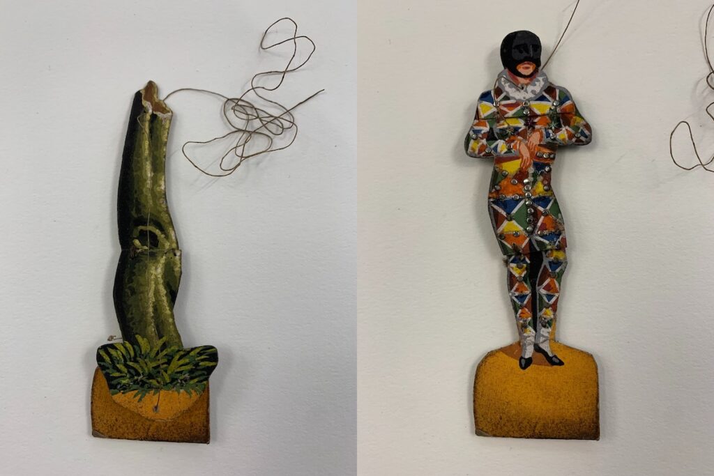The toy theater offers a material equivalent to the stage’s capacity to destabilize narrative and social hierarchies through visual and narrative tricks in its evocation of the Harlequinade pantomime mode. The cut and mounted props and set pieces of toy theaters lent themselves particularly well to the pantomime tricks of the Harlequinades, and special sheets were printed to assist in the magical transformation that Harlequin always effected in the afterpieces. Figure 8, for example, presents the makings of the transformation of an old woman into a grimacing bulldog or a chair (Fig. 8). The dotted lines on some prints indicate how the pieces would align, and where they might be cut out and folded so that, with a pull of a string from above, the figure of Harlequin (or the director of a toy theater) could transform them with a tap of his magic bat. In a remarkable surviving example of a constructed transformation piece, a tree trunk quickly changes into Harlequin himself with a tug of the string (Fig. 9).