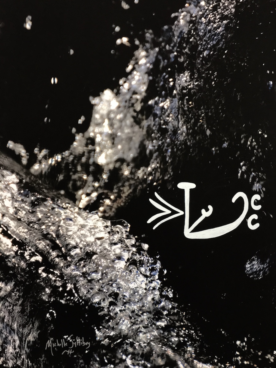 At the beginning of this process, I sifted through a komqwejwi’kasikl dictionary, examining the symbols with no instructions on how to use or read them.[9] Later, I learned that these “[h]ieroglyphic texts are composed of individual symbols (called glyphs) written horizontally from left to right. Each glyph represents a word in the Mi’kmaq language.”[10] You can see how they were used as maps. This intuition exploded in my Nm’ultes space-time creative endeavor. That November day, what lay before me was a komqwejwi’kasikl poem for the future and a clear understanding that learning the komqwejwi’kasikl written language will be a lifelong journey.